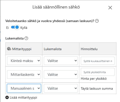 - Klik på [+ Tilføj] for at vælge målerberegning, manuel indtastning, fast gebyr