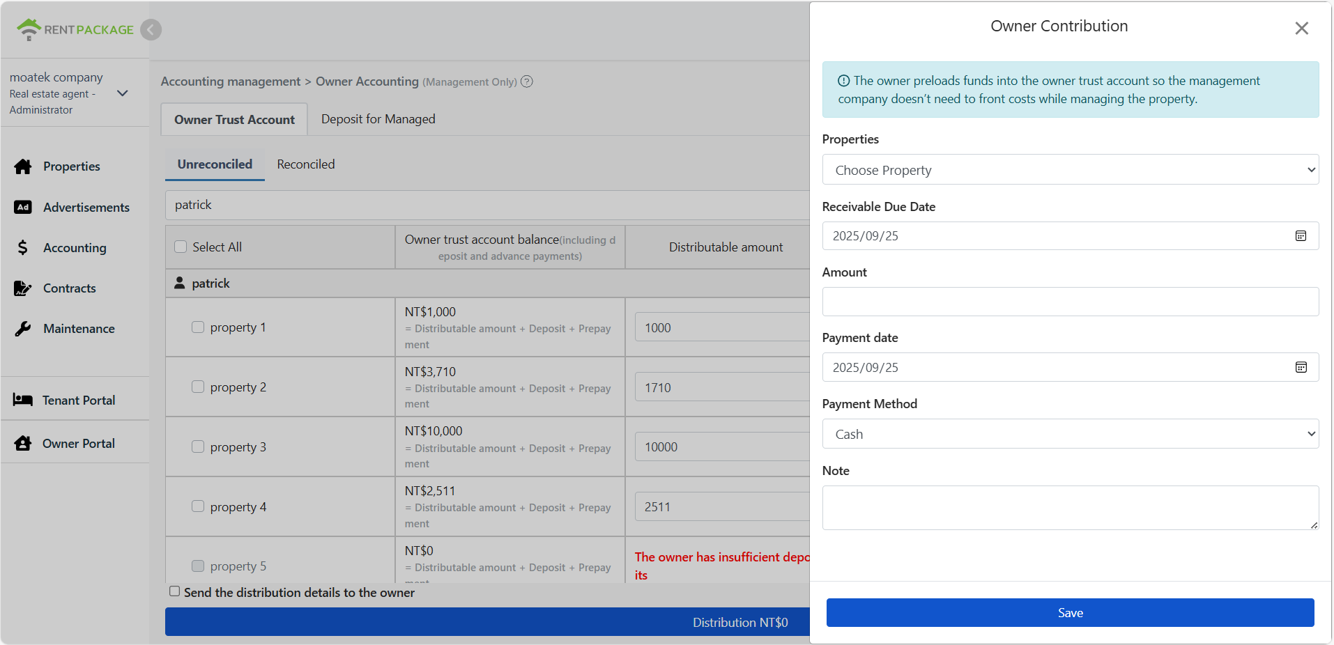 Every owner has a 'Trust Account' to temporarily hold all related funds. If the account has no initial funds, the owner can add money via [Owner Deposit] (Owner Contribution) to avoid the manager advancing cash.