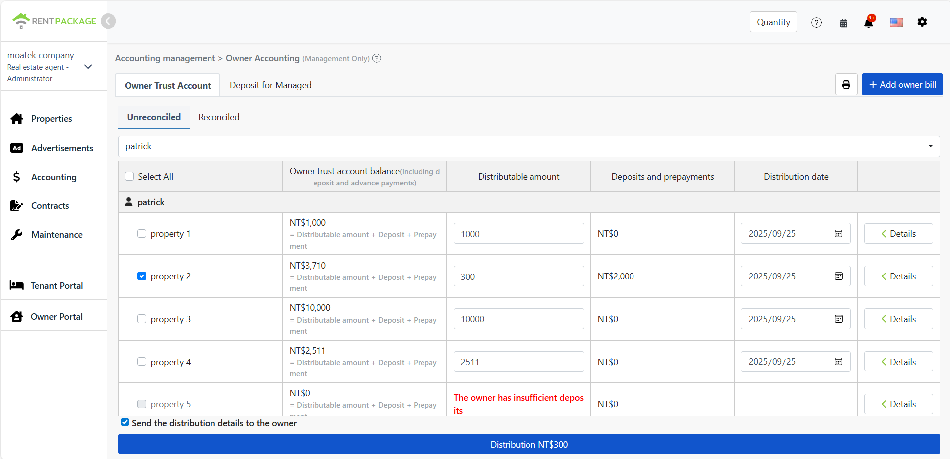 - Go to [Accounting] > [Owner Accounting] > [Untransferred] tab