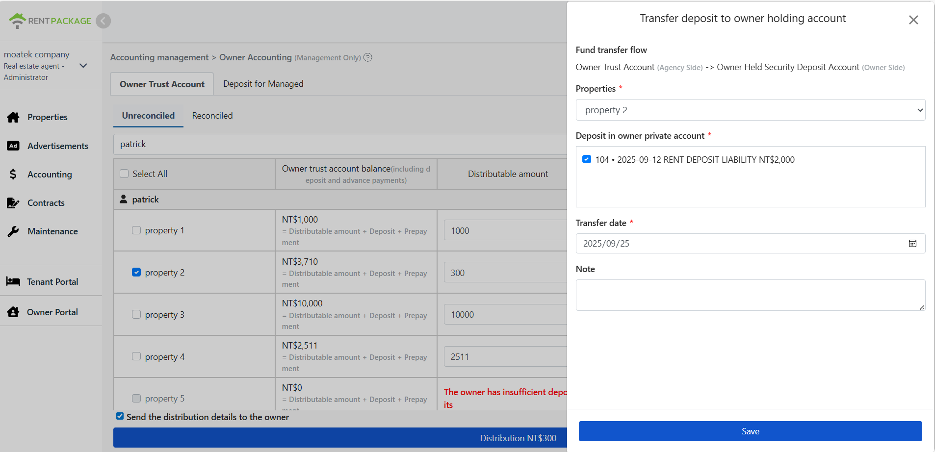 - The system lists all properties and the 'Transferable amount'