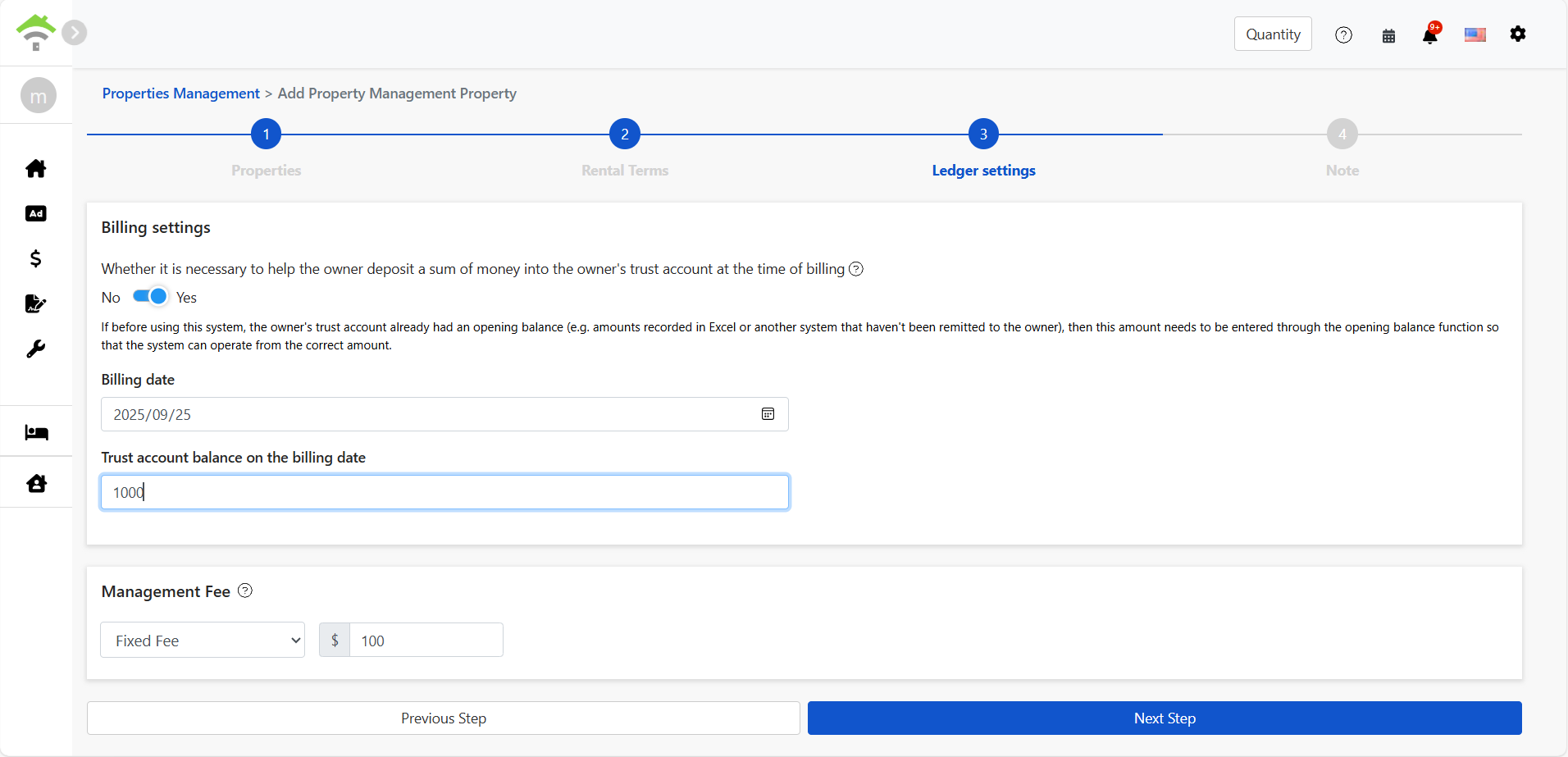 During initial setup, if you have outstanding balances from a previous system, you can use 'Opening Income' in [Add Property/Contract] to record them into the Trust Account and establish a complete starting ledger.