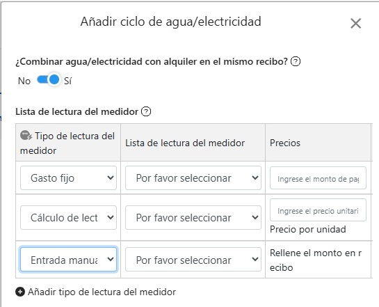 - Hacer clic en [+ Nuevo], puede elegir lectura del medidor cálculo, entrada manual, tarifa fija