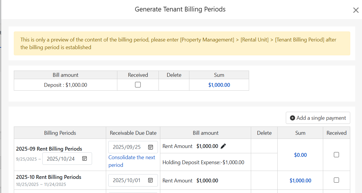 سیستم «درآمد سپرده» پیشپرداخت را بهطور خودکار در حساب دوره اول کسر میکند، همانطور که در تصویر نشان داده شده است: