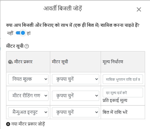 - [+ नया] पर क्लिक करें, मीटर रीडिंग गणना, मैनुअल एंट्री, फिक्स्ड शुल्क चुनें