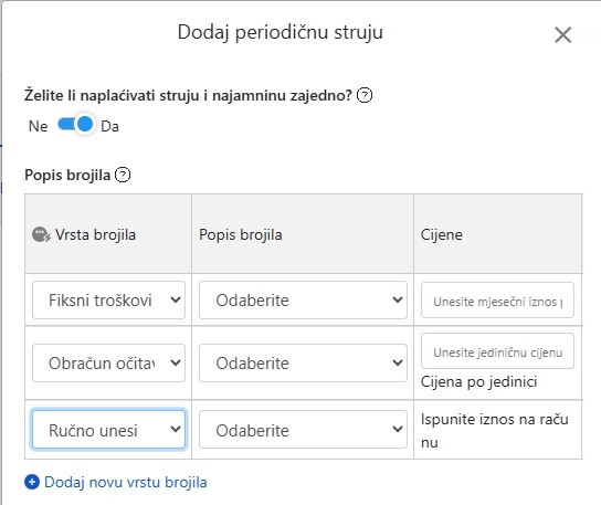 - Kliknite [+ Dodaj], možete odabrati obračun po mjerenju, ručni unos ili fiksnu naknadu