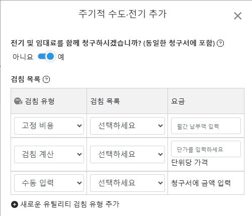 - [+ 새로 추가] 클릭 시 검침 계산, 수동 입력, 고정 비용 선택 가능