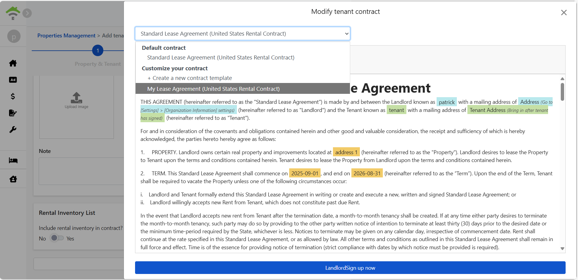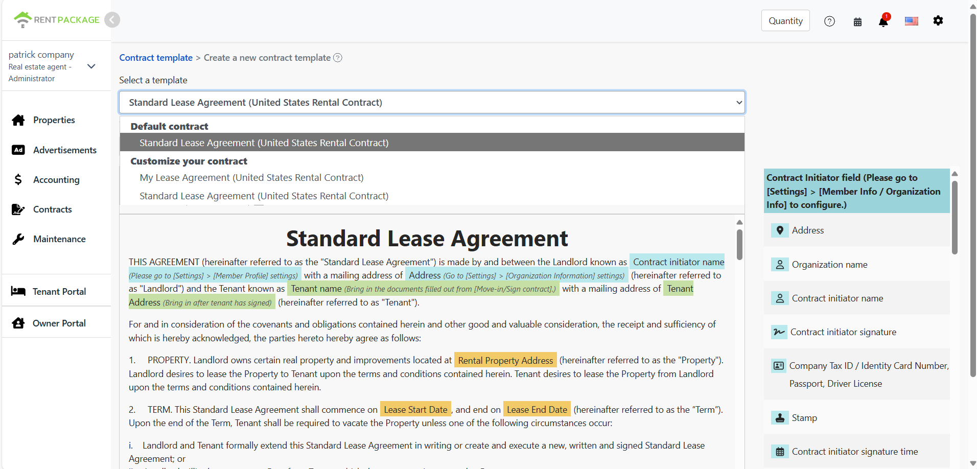 स्क्रिनले दायाँ बाँया दुई भागमा विभाजित गर्दछ, दायाँपट्टि तान्न सकिने भेरिएबल फिल्डहरू छन् (जस्तै: मालिक नाम, भाडा, भाडावाल हस्ताक्षर आदि), बायाँपट्टि करार सामग्री क्षेत्र छ, तपाईंले सिधै पाठ परिमार्जन गर्न र भेरिएबल फिल्डहरू सम्मिलित गर्न सक्नुहुन्छ।