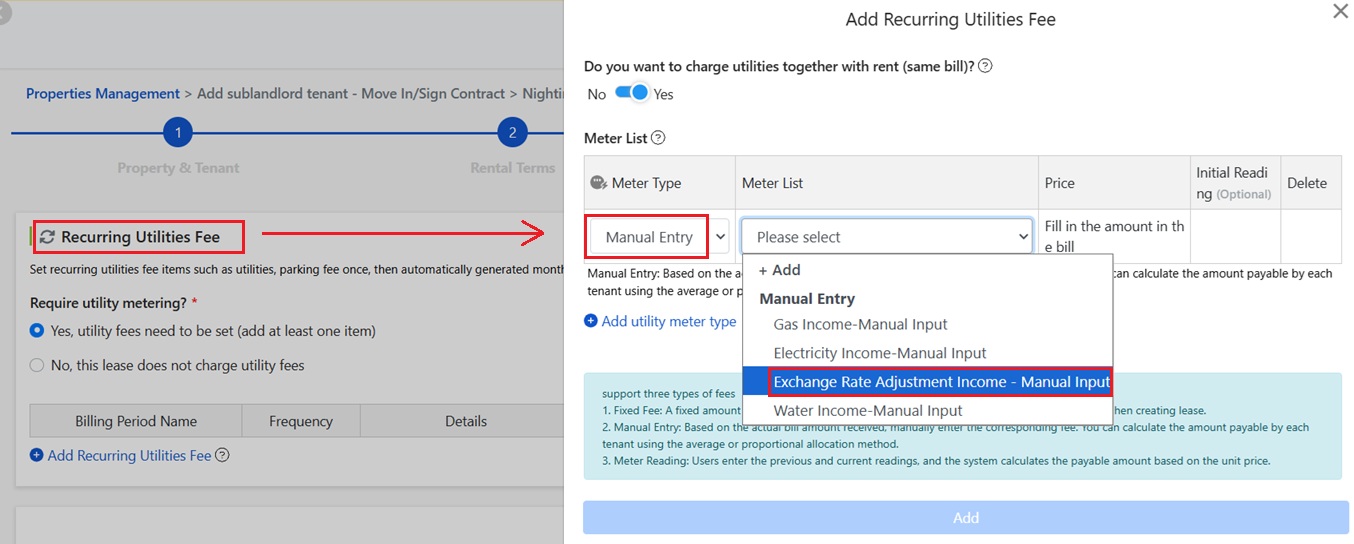 在新增週期性水電費時,請於【抄表類型】選擇【手動輸入】,以便後續自行調整金額。