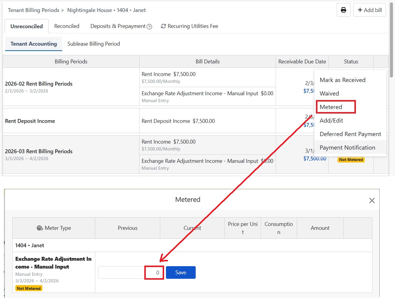 在租金帳期完成金額調整後,此時此筆帳仍在【未抄表】狀態。在【抄表】> 【匯率確認】欄位填寫數值(需填 0),代表本期已確認完成。